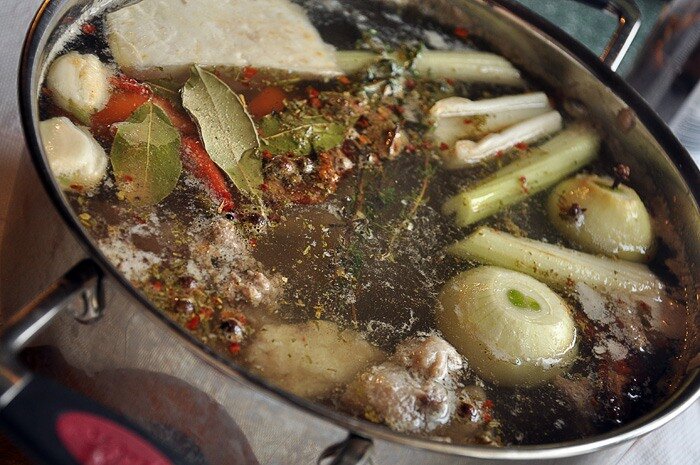 На сильном огне довожу бульон до кипения, тщательно снимаю пену.